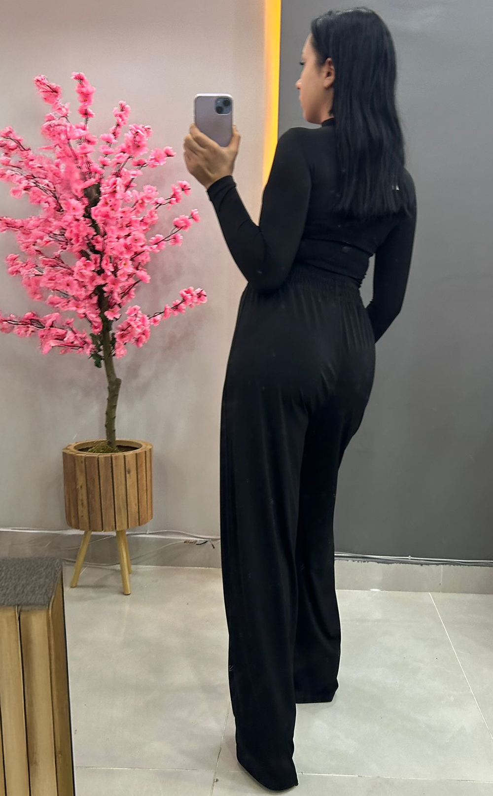Şık ve rahat bir kombin olan bu siyah crop bluz ve pantolonlu takım, her ortama uyum sağlar.